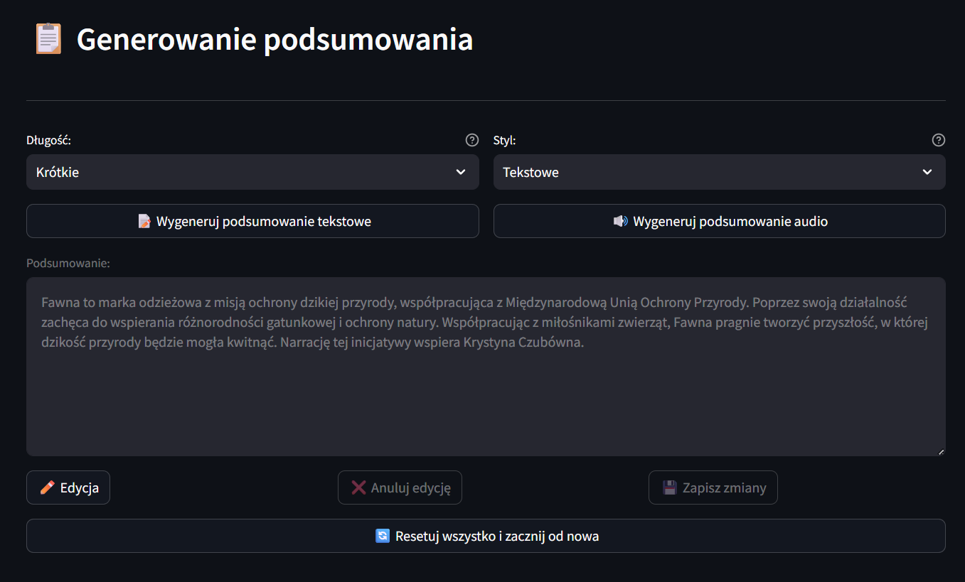 - Różne poziomy szczegółowości (krótkie/średnie/długie)