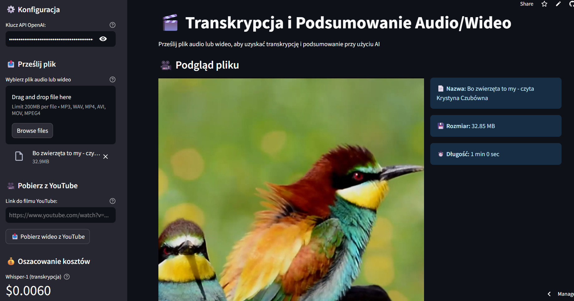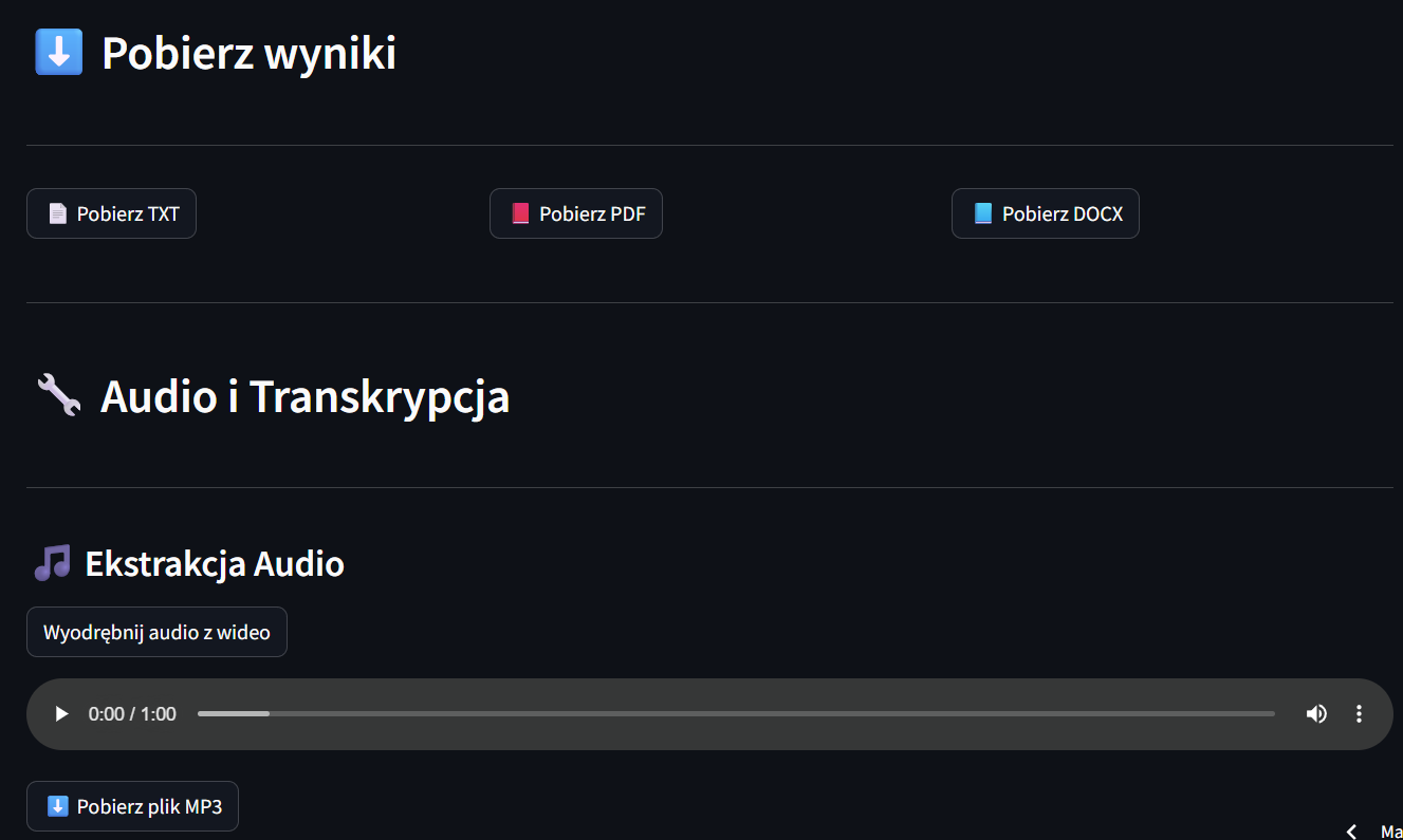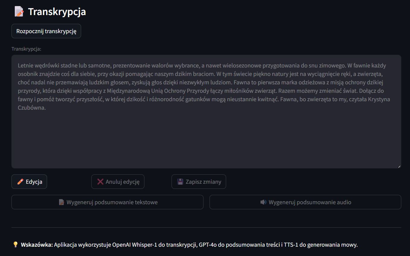 - Wykorzystanie Whisper API do transkrypcji audio